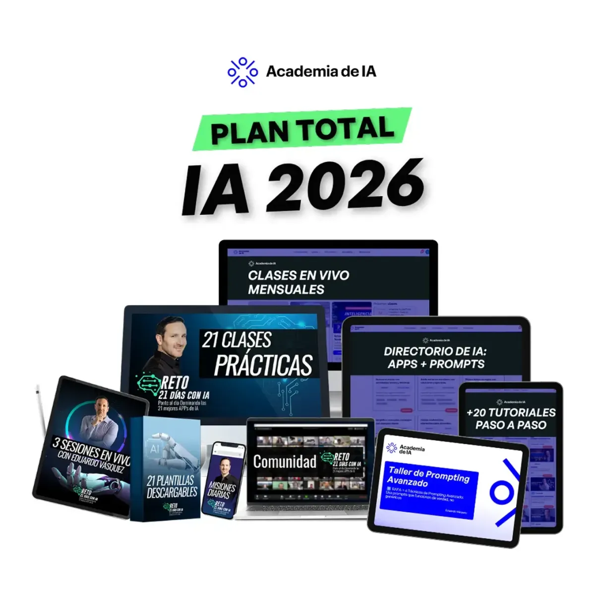 El Plan Total IA 2026 está formado por tres pilares que te acompañan desde el aprendizaje hasta la implementación real